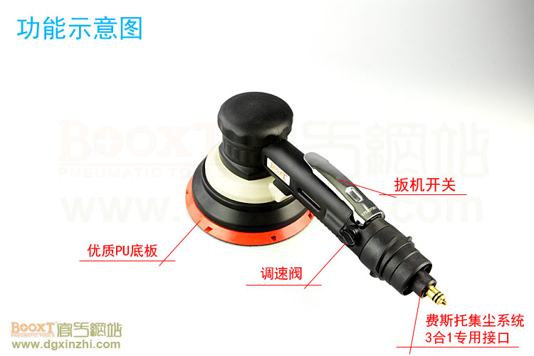• 產(chǎn)品參數(shù): 底盤尺寸:6寸(150mm);轉(zhuǎn)速:10000rpm;偏擺:5mm;重量:1.2kg;使用氣壓:0.65Mpa;推薦內(nèi)徑8mm氣管;耗氣量:0.53立方米/分鐘;機(jī)器使用時(shí)多加氣動(dòng)油保養(yǎng);需搭配集塵桶或中央集塵設(shè)備使用