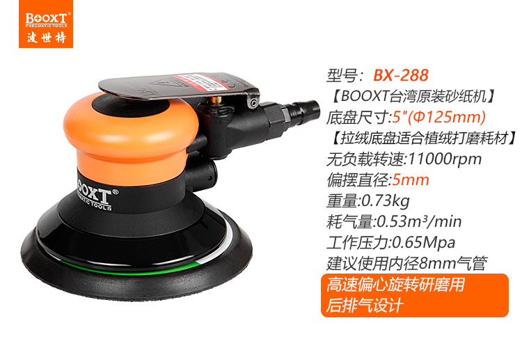 • 產(chǎn)品參數(shù): 底盤(pán)尺寸:125mm(5寸) 空載轉(zhuǎn)速:11000rpm 偏擺直徑:5mm 重 量:0.73kg 耗 氣 量:0.53m3/min 【專(zhuān)業(yè)型】