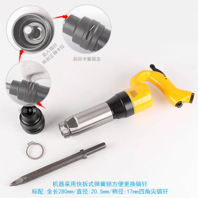 • 產(chǎn)品用途: 配合不同規(guī)格的鏟頭或鎬尖,去除各種附著物如涂料、鐵銹、焊漬、 鑄件剝離、清除水泥、涵洞巖石破碎等作業(yè)。