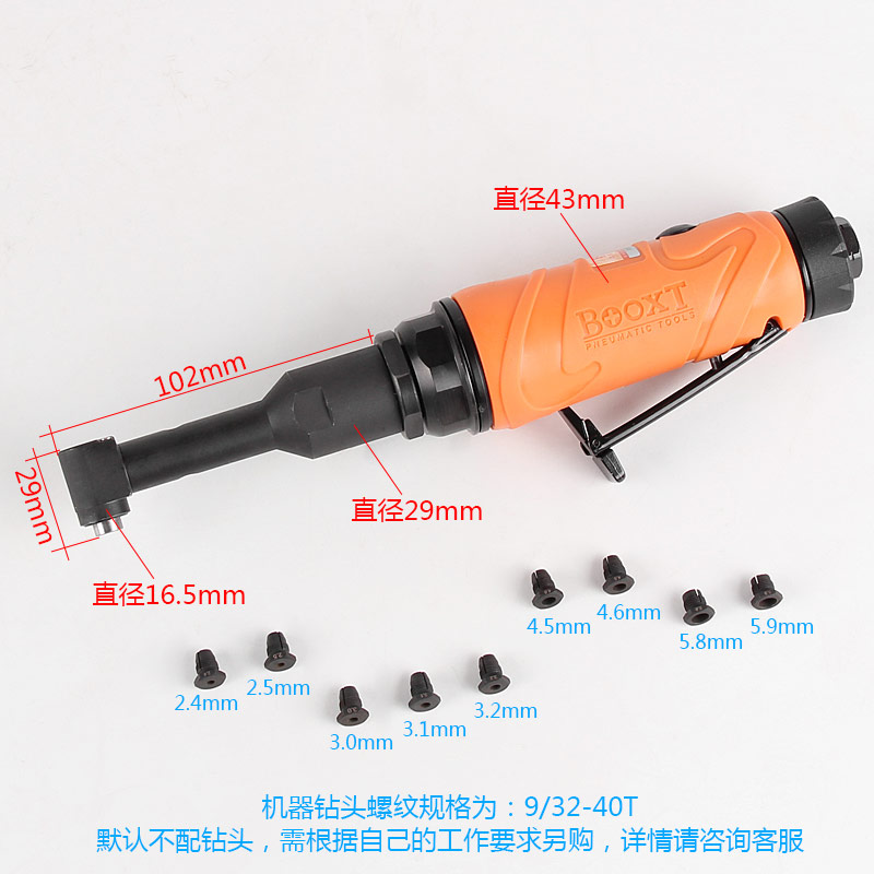 • 產(chǎn)品參數(shù): 夾頭螺牙:9/32"*40T 空載轉速:3600rpm 馬達功率:0.5HP 全 長:258mm 重 量:0.86kg 耗 氣 量:99L/min