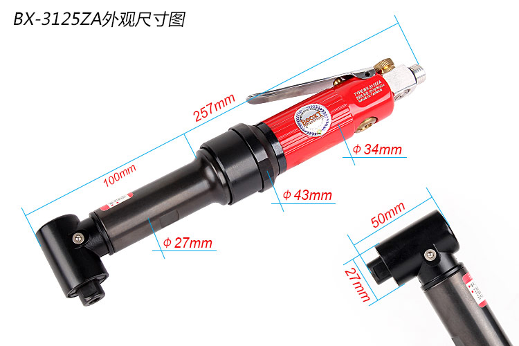 • 產(chǎn)品參數(shù): 夾頭尺寸:1/4"*28T 空載轉(zhuǎn)速:2500rpm 彎角高度:50mm 全 長:286mm 重 量:0.92kg 耗 氣 量:0.38M3/min