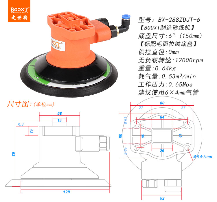 • 產(chǎn)品參數(shù): 底盤尺寸:150mm (6寸) 偏擺直徑:0mm (同心) 空載轉(zhuǎn)速:12000RPM 重 量:0.64KG 耗 氣 量:0.53M3/min 【塑鋼外殼/同心】