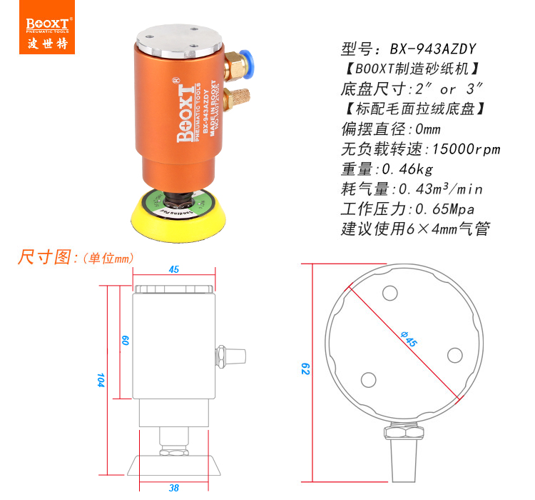 • 產(chǎn)品參數(shù): 底盤尺寸:50mm/75mm (2寸/3寸) 偏擺直徑:0mm 空載轉(zhuǎn)速:15000RPM 重 量:0.46KG 耗 氣 量:0.43M3/min