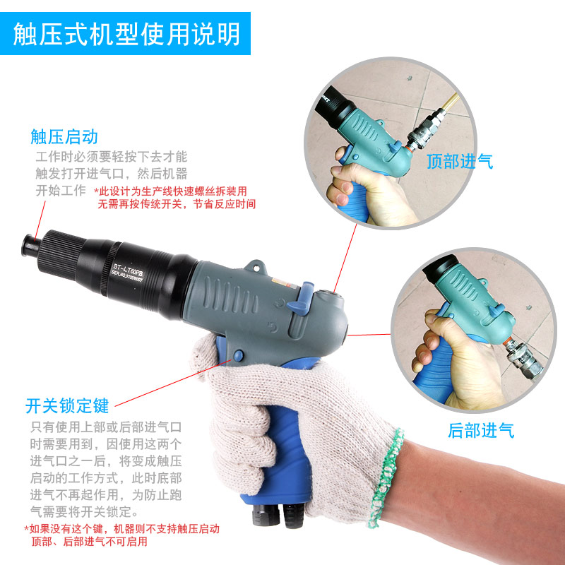 A.觸壓式(全自動):靠風(fēng)批頭頂螺絲頭啟動,到達(dá)預(yù)設(shè)扭力自動停止。(效率高)