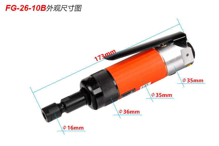 • 產(chǎn)品參數(shù): 夾頭能力:M3,6 (標(biāo)配M6) 馬達(dá)功率:0.35HP 空載轉(zhuǎn)速:24000rpm 工具能力:砂輪磨頭M25,旋轉(zhuǎn)銼刀M13 耗 氣 量:0.4m3/min 全 長(zhǎng):173mm 重 量 : 0.5kg 噪 音 值:83db(A) 【工業(yè)型/扳機(jī)開(kāi)關(guān)】