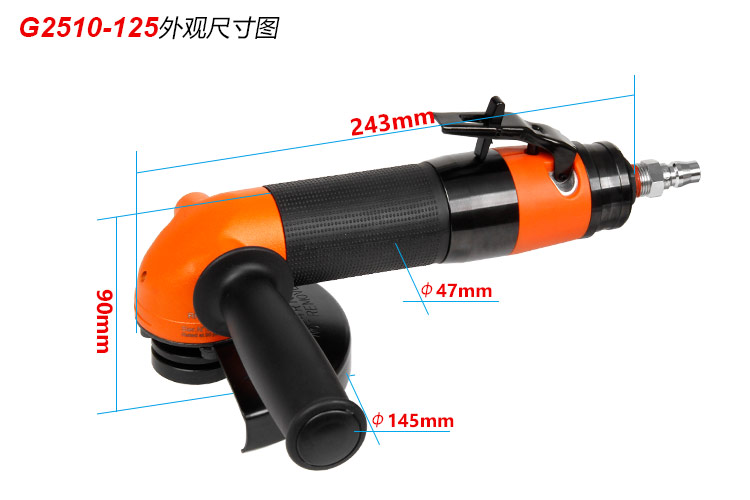 • 產(chǎn)品參數(shù): 砂輪尺寸:125mm(5寸) 主軸螺牙:M14*2.0 馬達(dá)功率:1.1HP 空載轉(zhuǎn)速:12000rpm 耗 氣 量:1.5m3/min 全 長:243mm 重 量:1.88kg 噪 音 值:90db(A) 【工業(yè)型/扳機(jī)開關(guān)】
