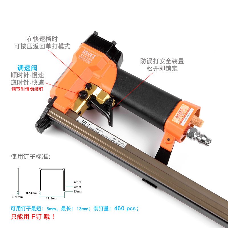 • 產(chǎn)品參數(shù): 特點(diǎn):可調(diào)節(jié)快速連打,自帶防誤打安全開關(guān);釘子寬度:11.2mm;釘子跨度:10mm;釘腳尺寸:0.51×0.74mm;使用釘子長度范圍:6-13mm;裝釘量:460個(gè);使用工作氣壓:0.6Mpa;推薦使用內(nèi)徑6.5mm氣管;平時(shí)多注意定時(shí)排放空壓機(jī)水份